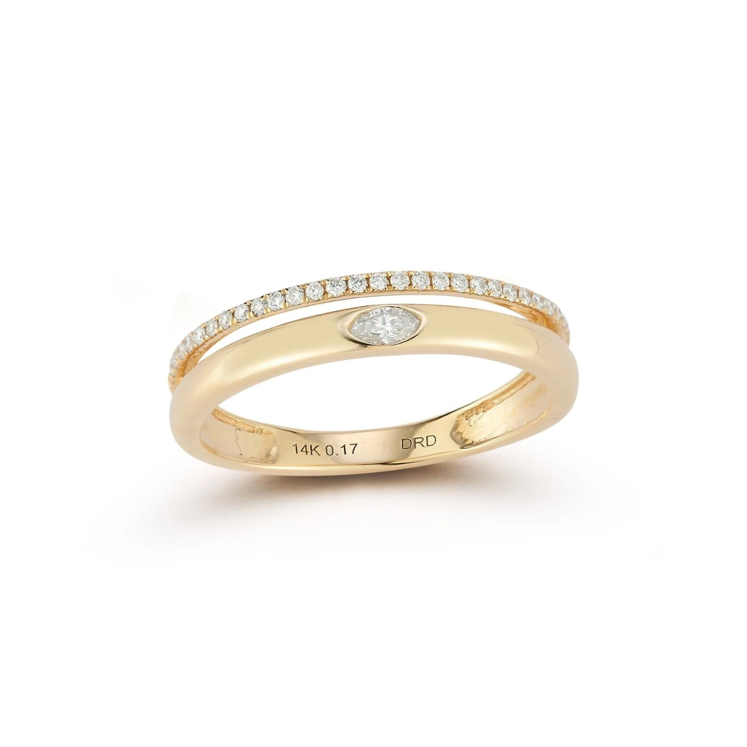 14k yellow gold ring with a marquise diamond and a row of pave diamonds.