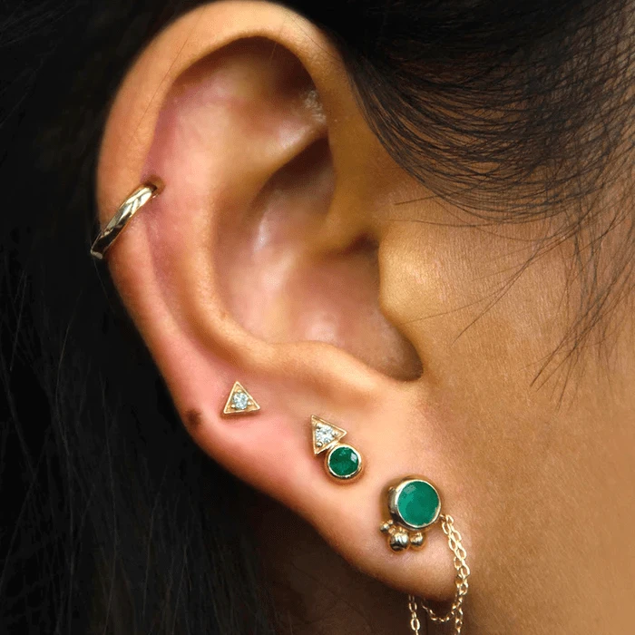 Delicately mounted on a gold post is a dazzling diamond encrusted in a dainty triangle setting and a bezel set gemstone. These Art-Deco inspired micro studs are the ideal layering staple.
