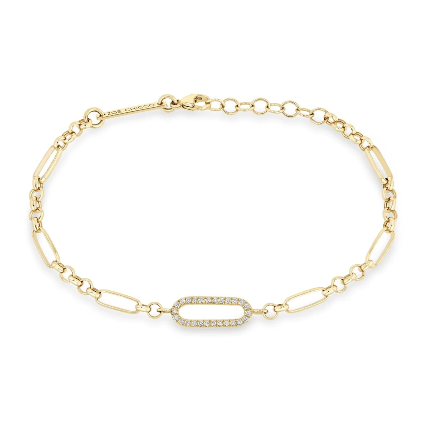 14K Yellow Gold Paperclip And Rolo Chain Bracelet With Pave Diamond Link