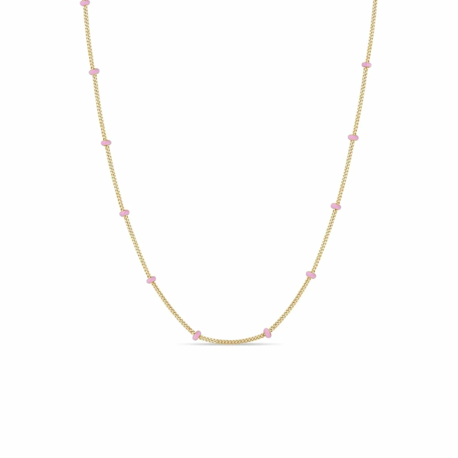 14K Yellow Gold Pink Enamel Curb Satellite Chain Necklace