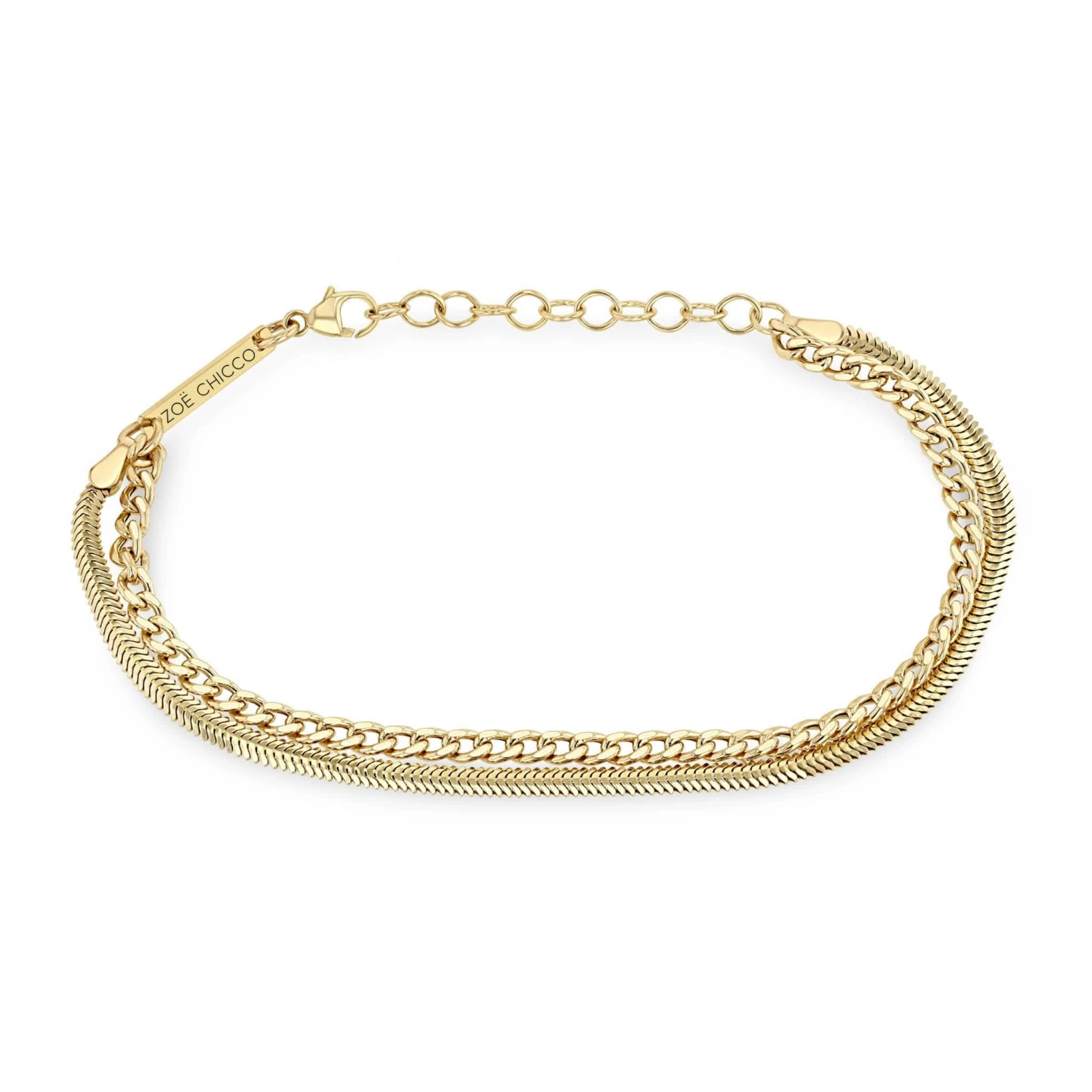 14k yellow gold small double chain bracelet with a mix of small curb and snake chains.