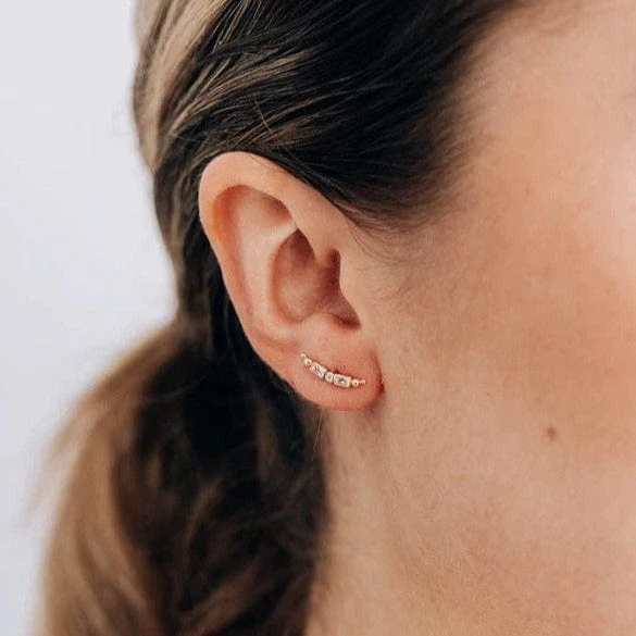 A cluster of white topaz baguette stones and a round diamond are bezel set and adorned with Dew Drop details, and mounted on a gold post to form an ear climber.