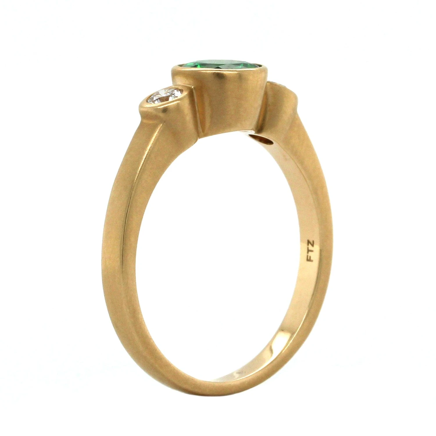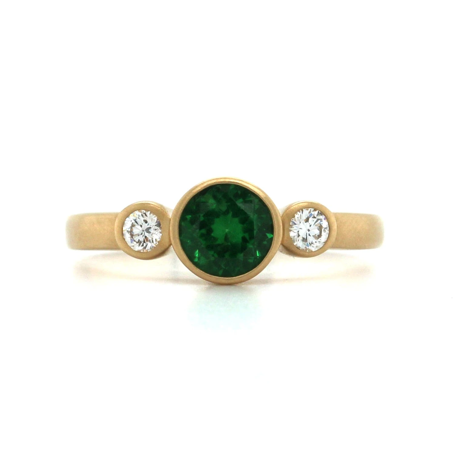 14k yellow gold bezel set vivid green tsavorite garnet set with diamond on the sides.