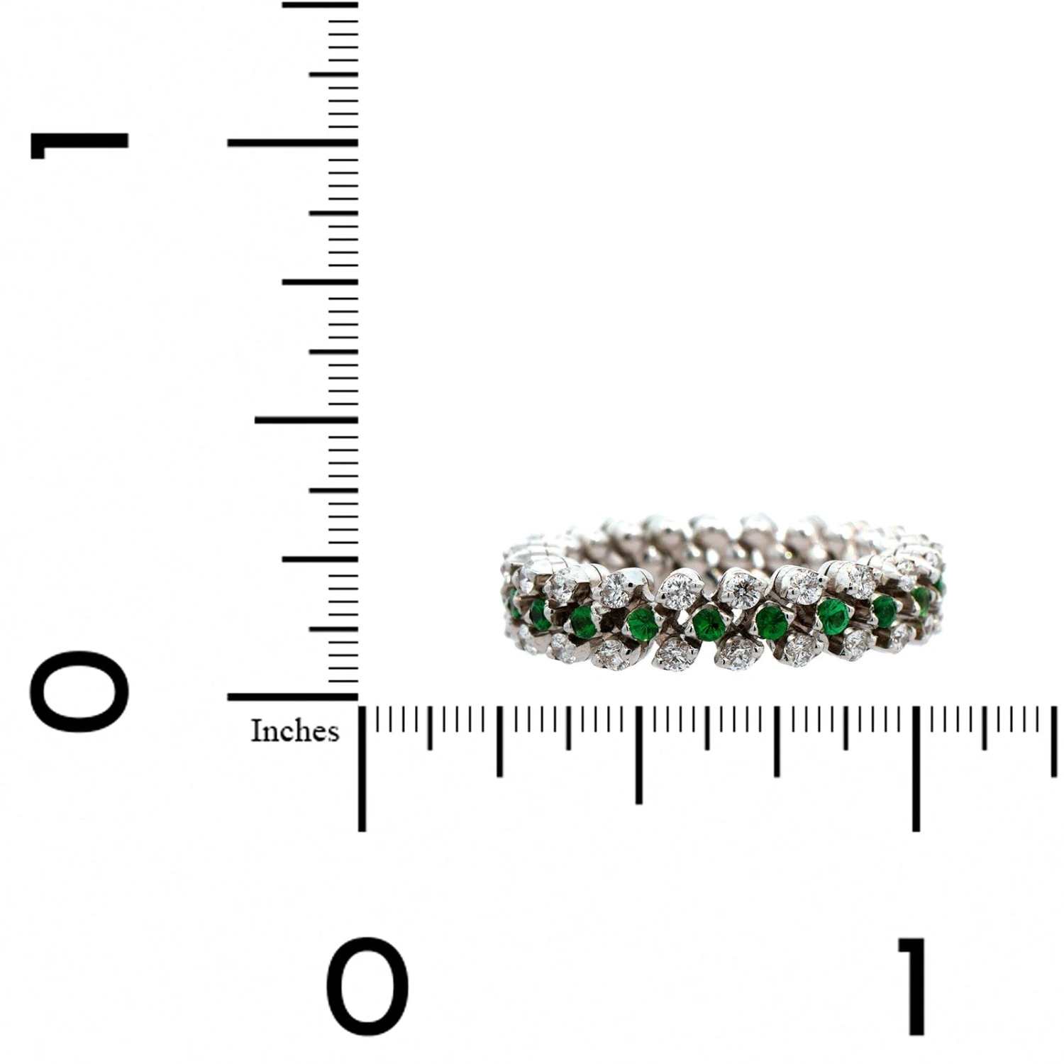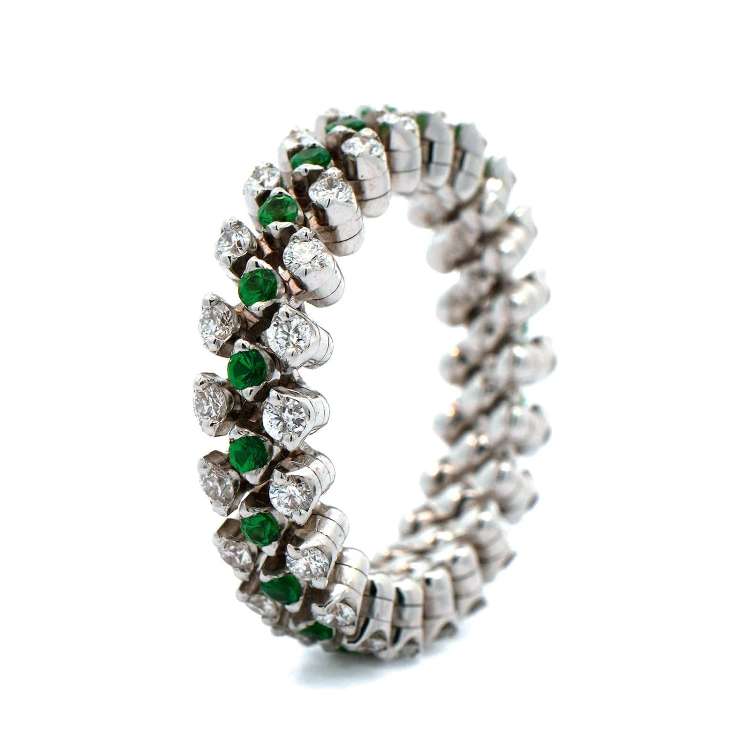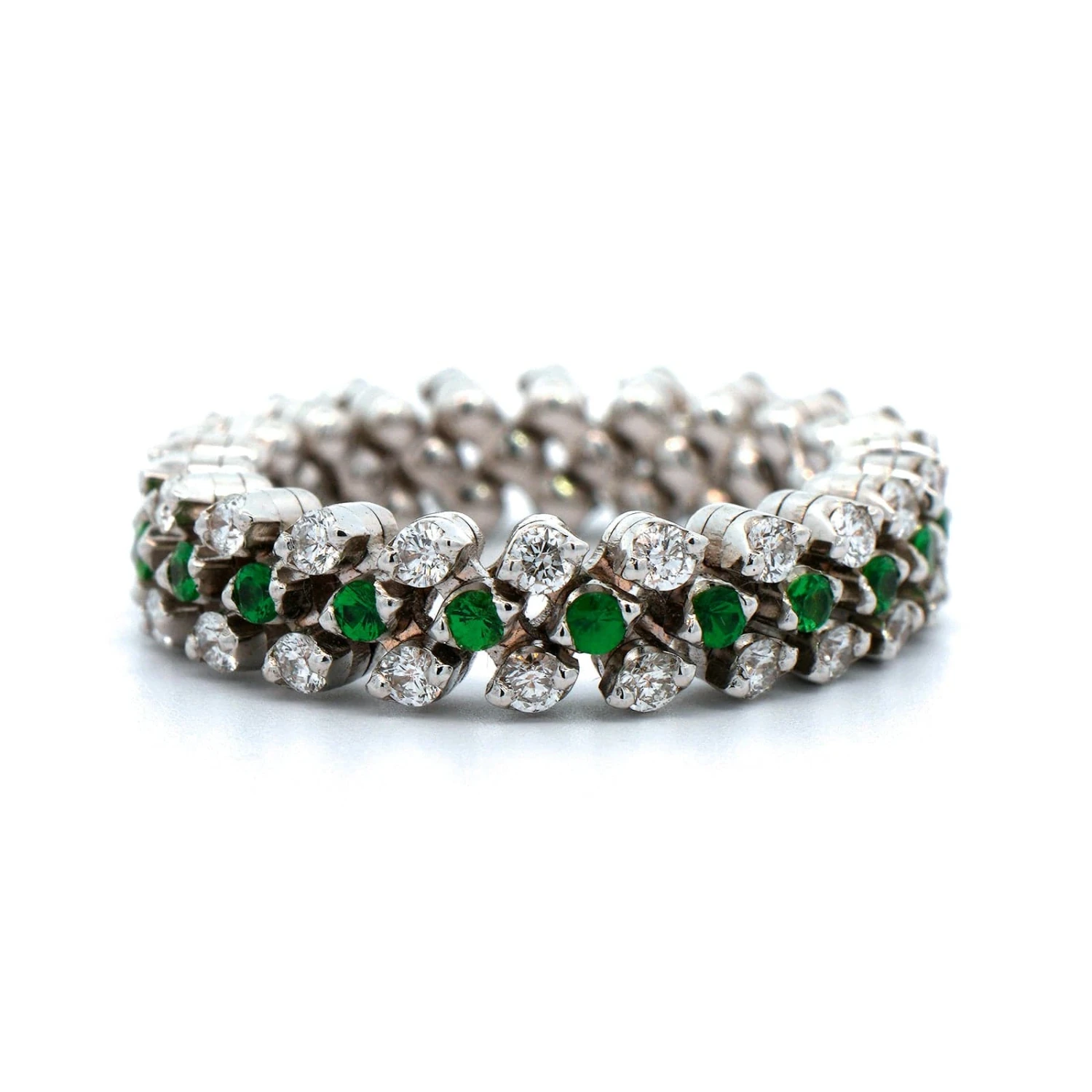 18k white gold 3 row ring with 2 rows of diamonds and 1 center row of tsavorite stones all the way around.