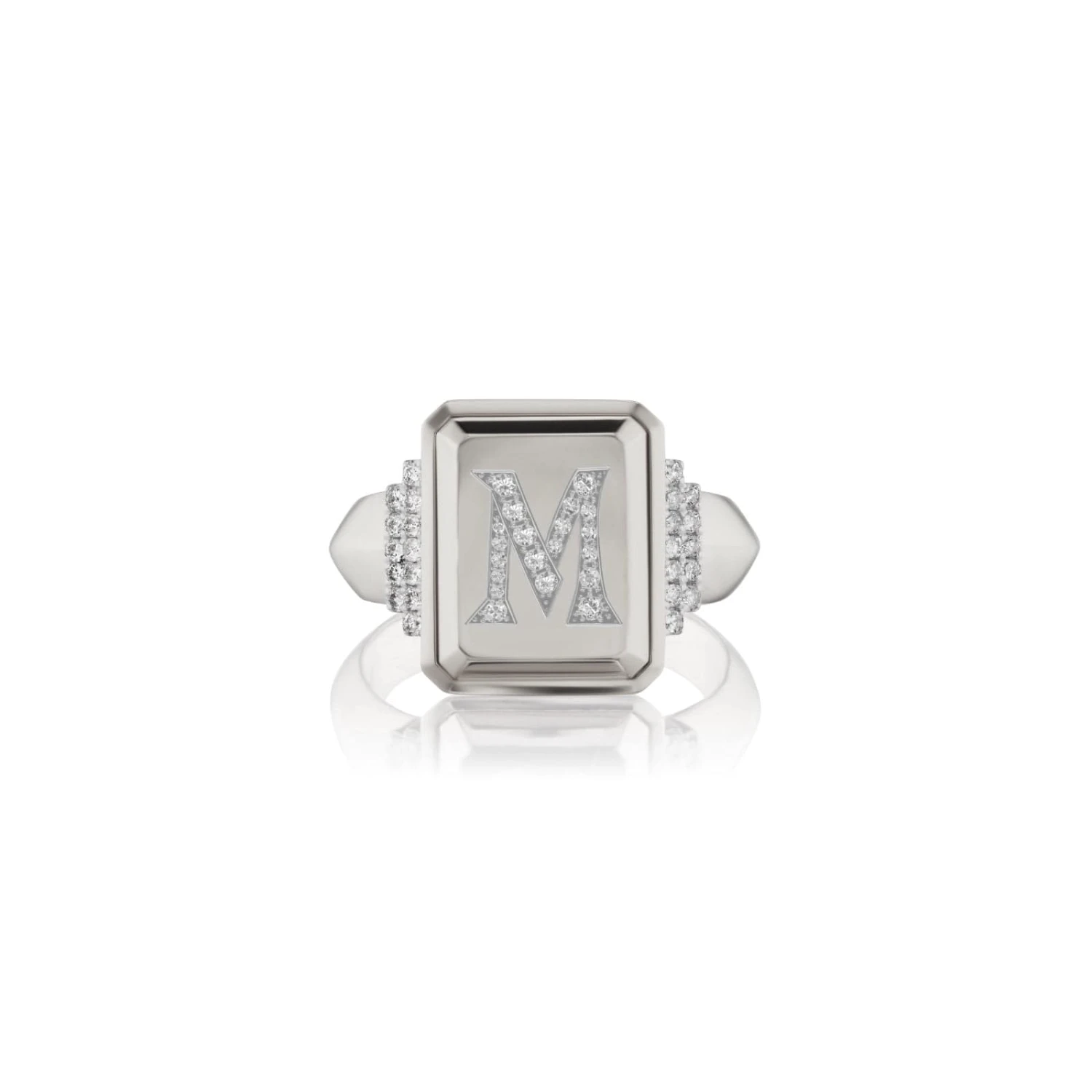 18k white gold signet ring featuring the initial M with pave diamonds.