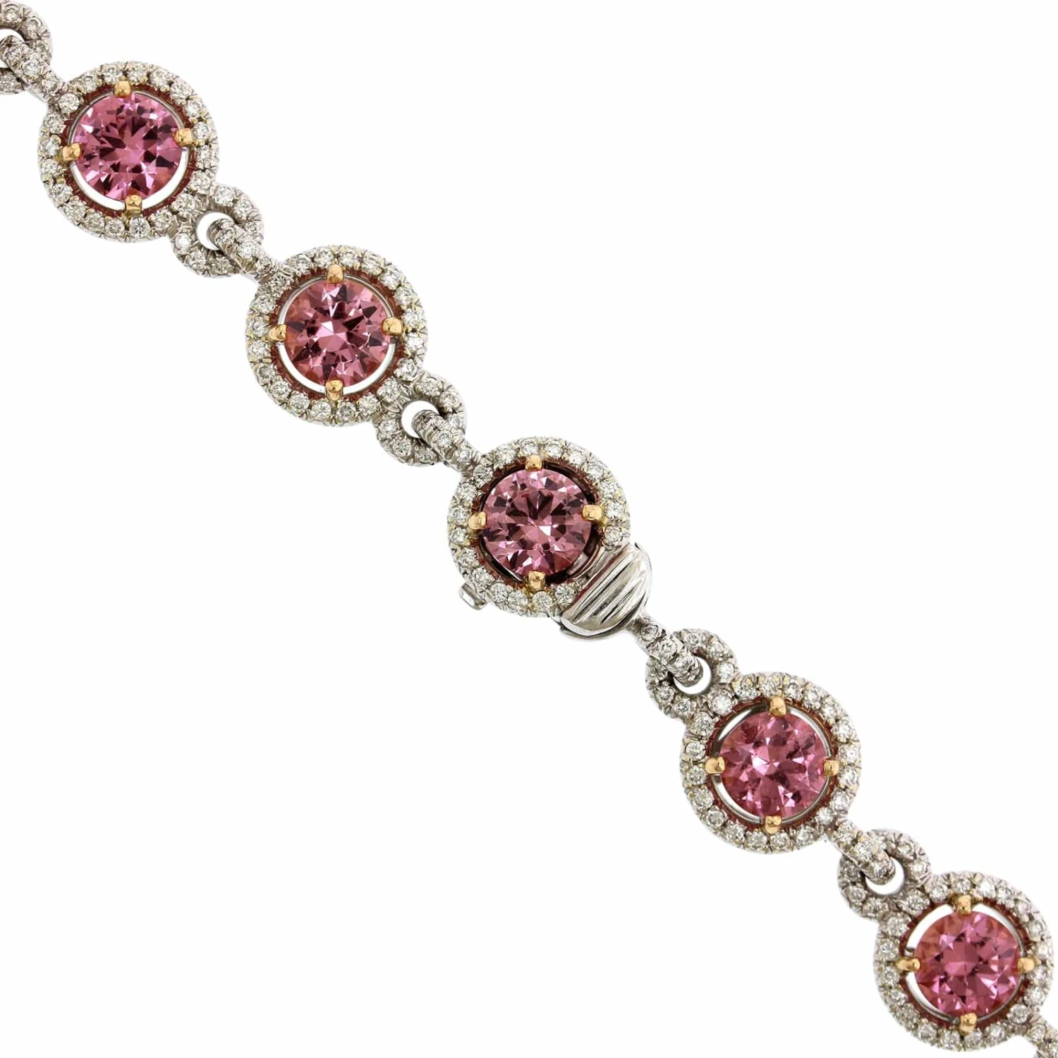 18k white gold necklace featuring 25 round pink spinels each surrounded by a halo of diamonds.