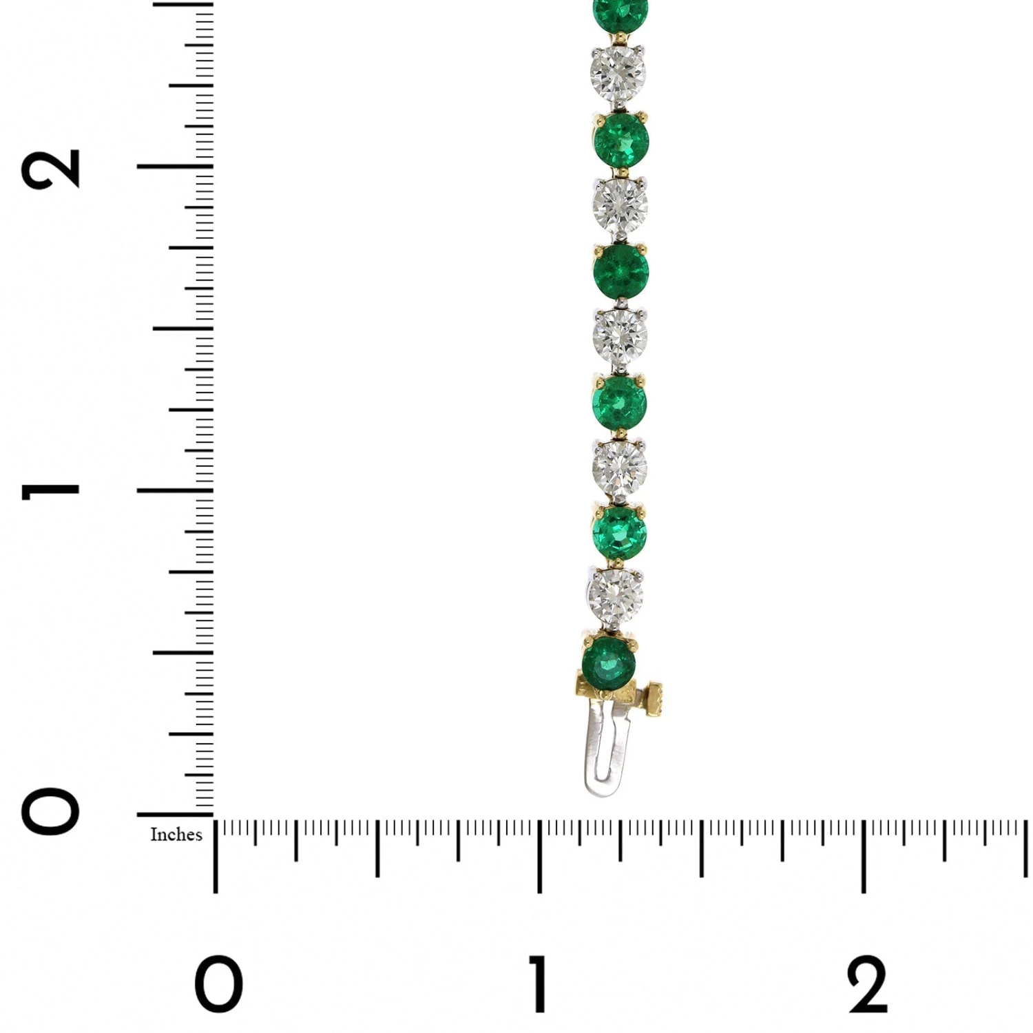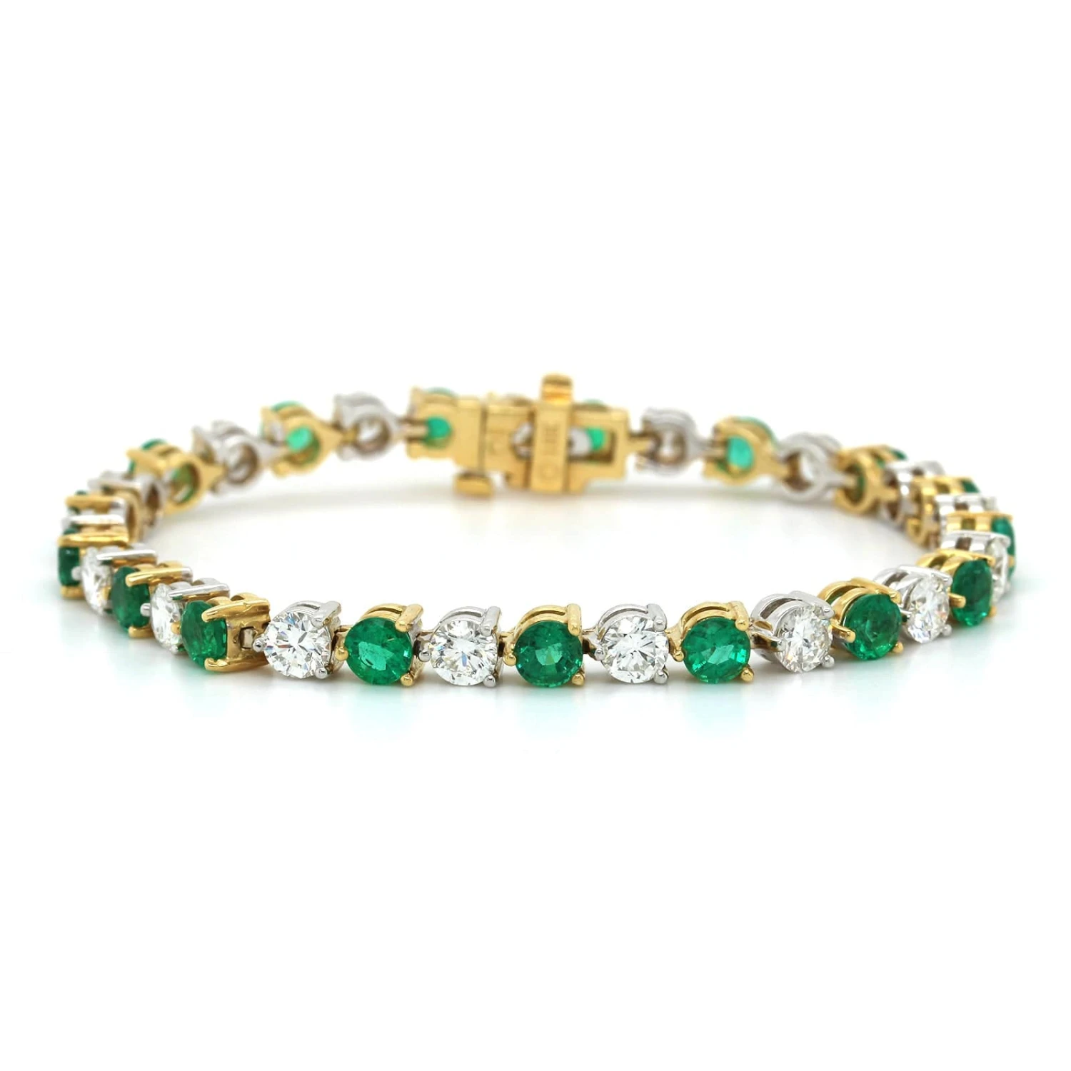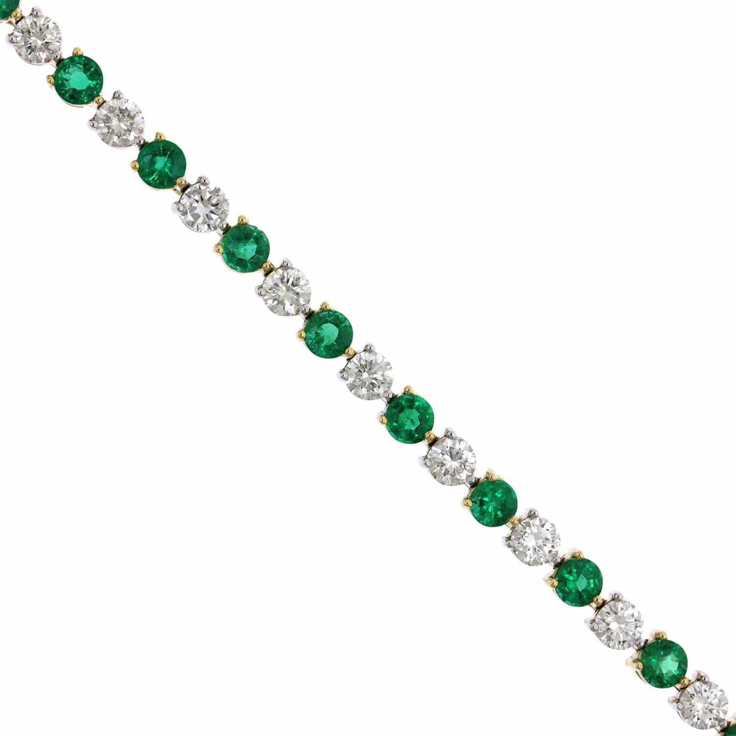 18k yellow and white gold tennis style bracelet alternating with emerald and diamonds.