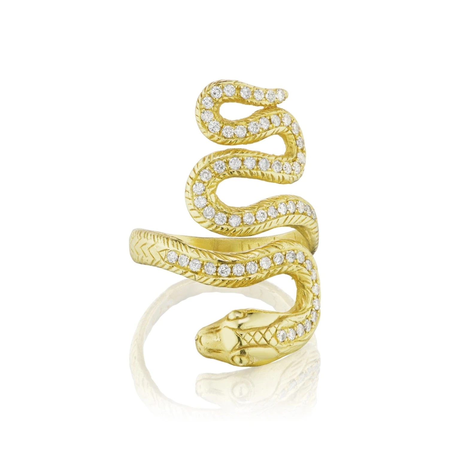 18k yellow gold snake ring featuring diamonds throughout.