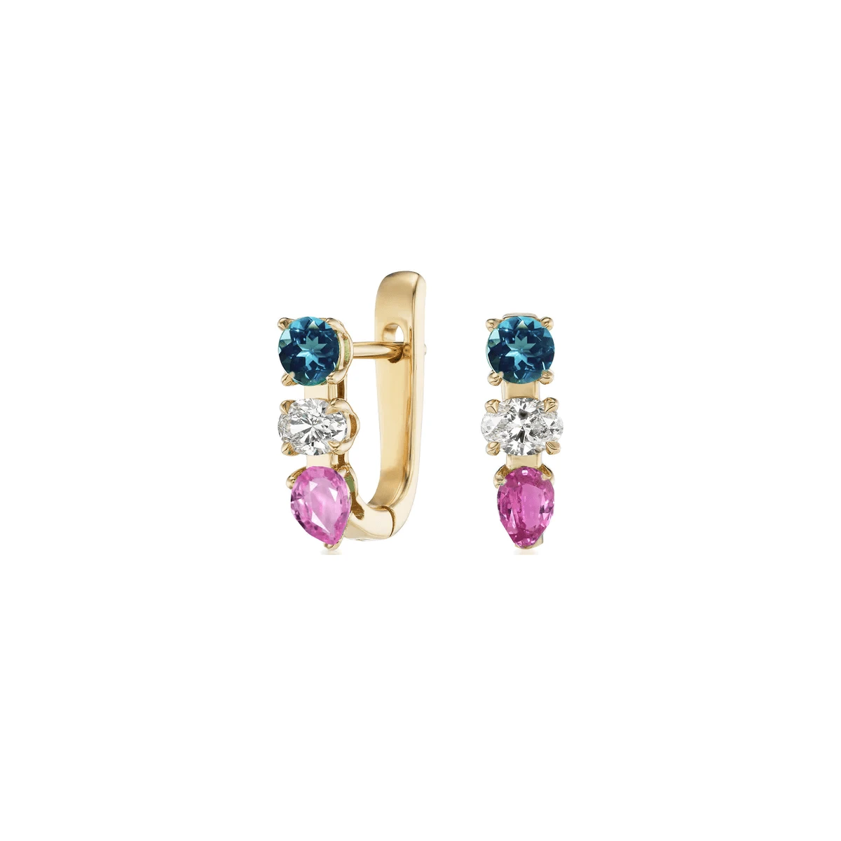 Handcrafted 18k yellow gold huggie earrings with sapphires and diamonds custom-cut into signature Monroe mixed shapes.