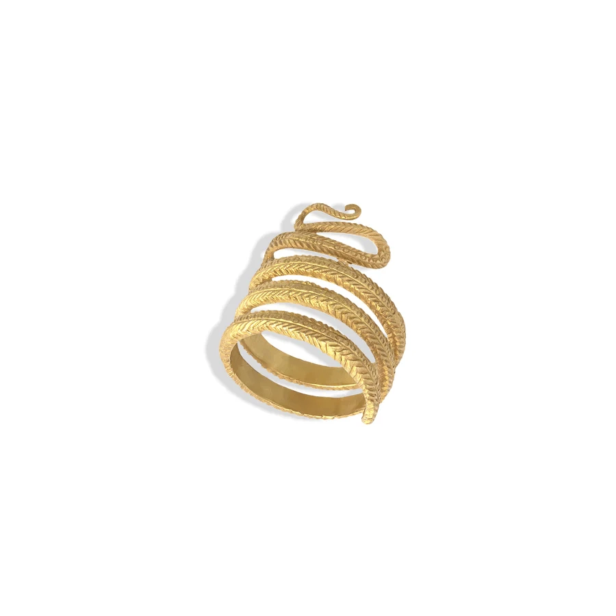 This ring showcases a coiling snake tail with a matte finish handcrafted in 18k yellow gold, adding richness and boldness to its intricate motif.