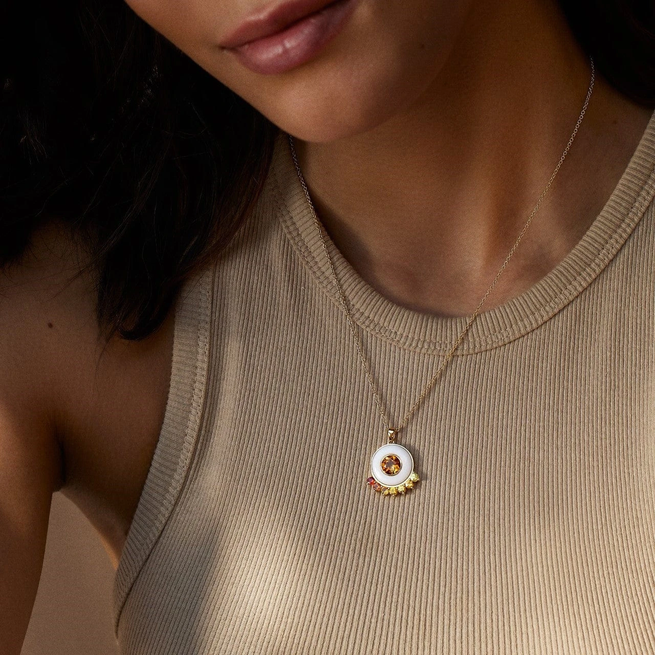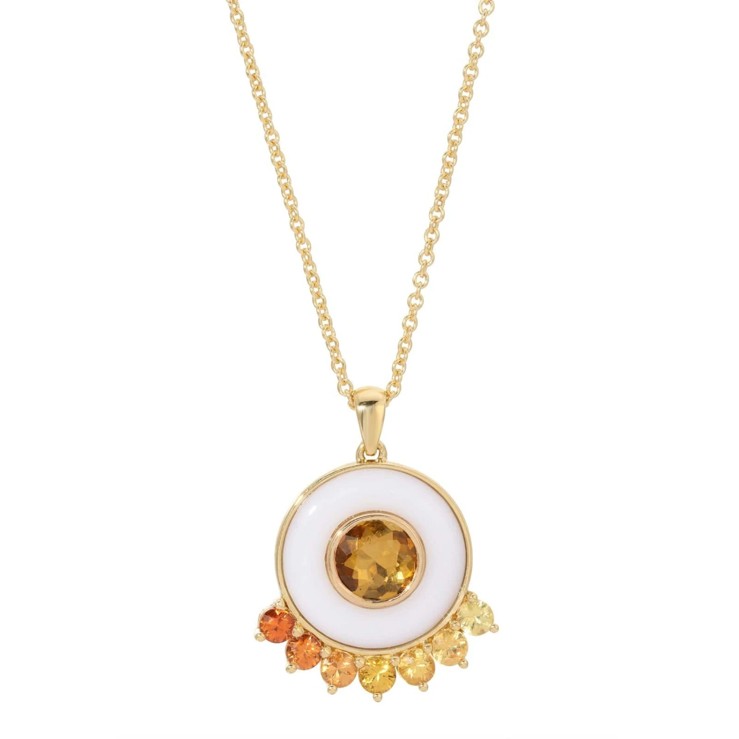 18k yellow gold necklace featuring yellow tourmaline, sapphire, and white agate on a circular pendant.