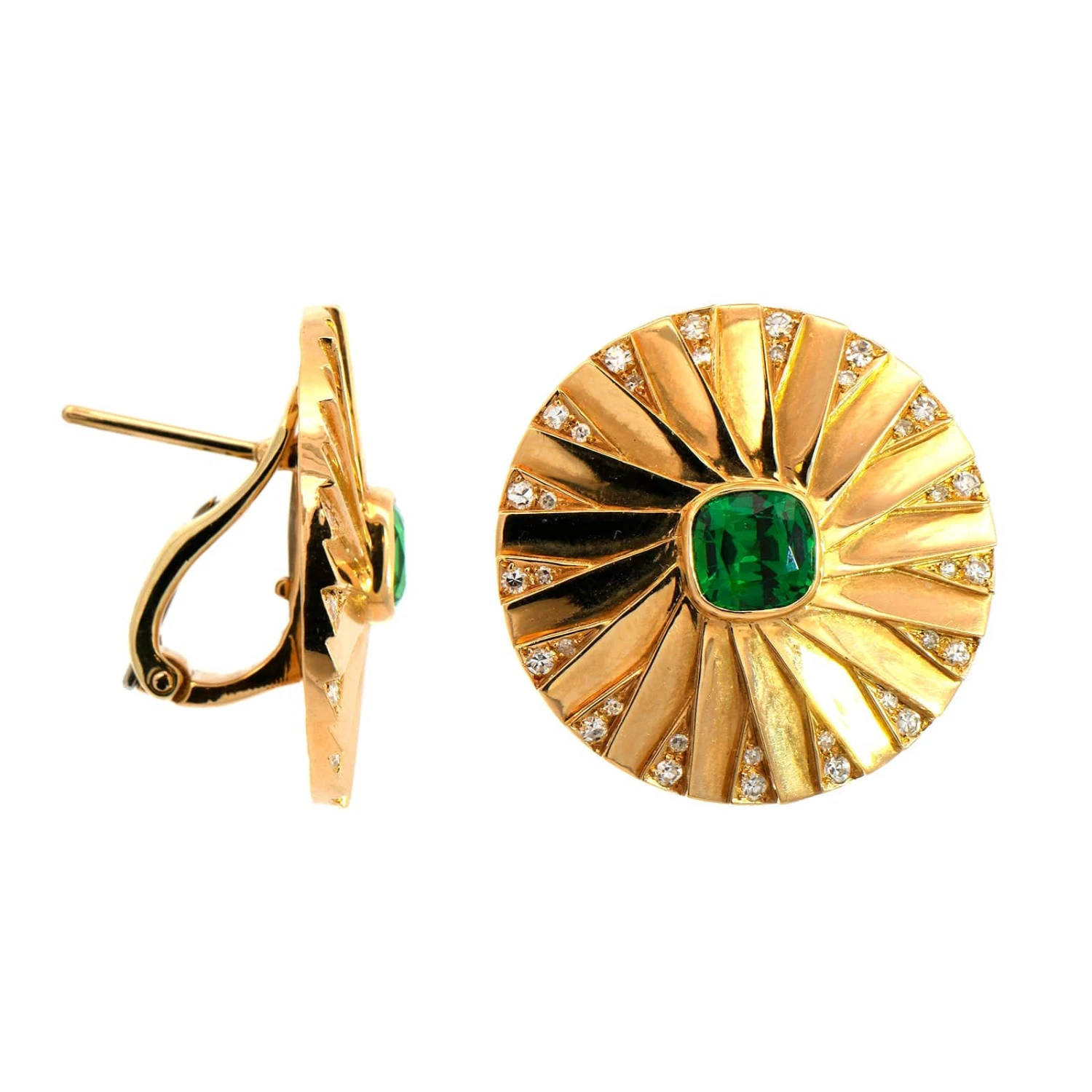 18k yellow gold tsavorite and diamond pin wheel stud earrings featuring a matched pair of cushion shaped tsavorite stones.