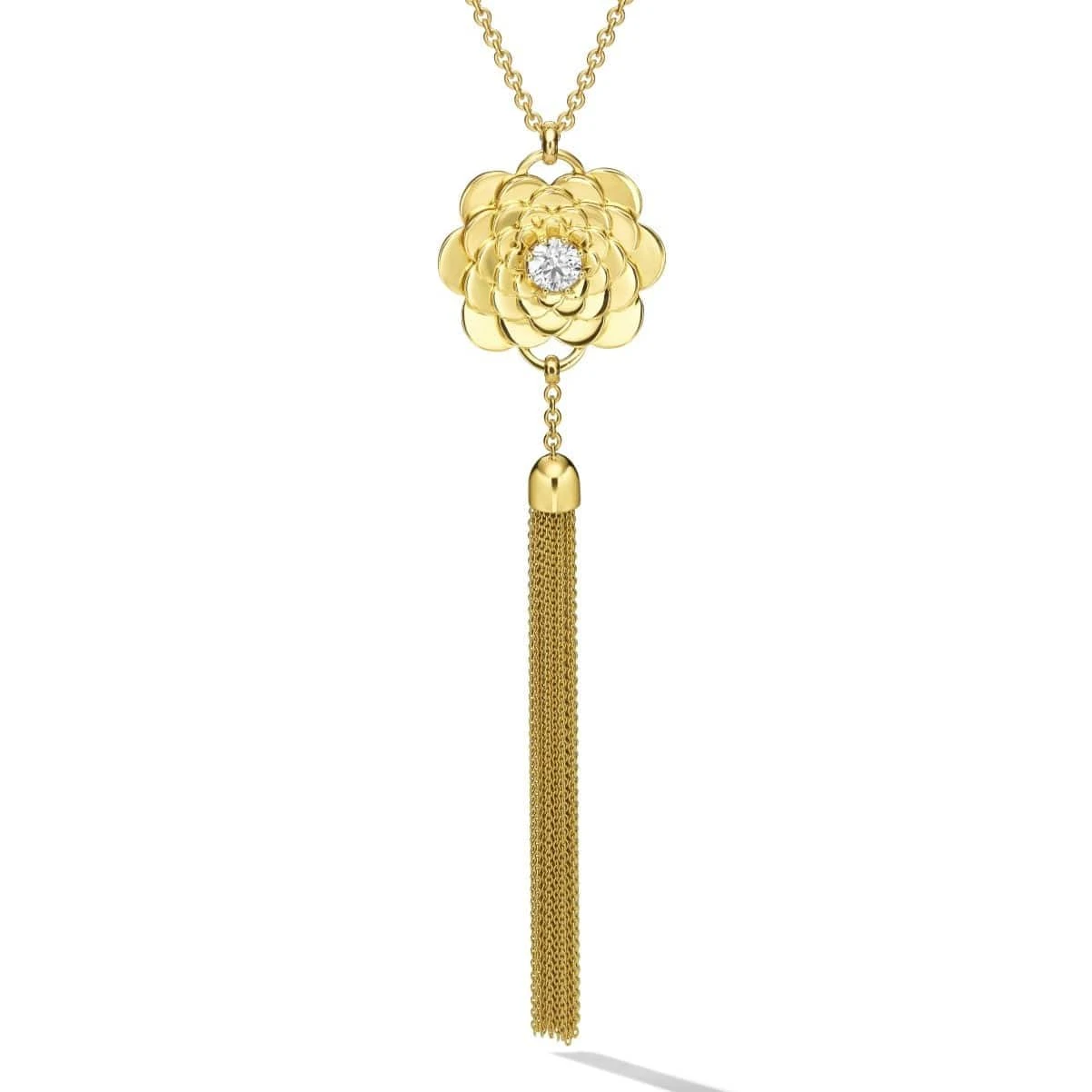 18k yellow gold necklace featuring a flower pendant with a diamond center and a hanging tassel.