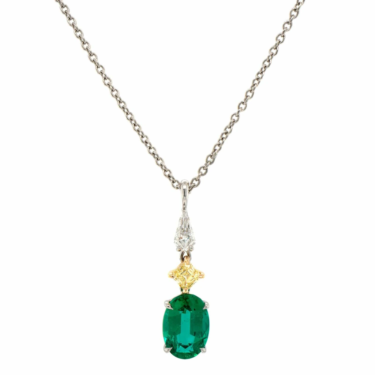 Platinum and 18k yellow gold with a fancy yellow asscher cut diamond and a kite diamond. Plus an oval Zambian emerald all on a platinum chain.