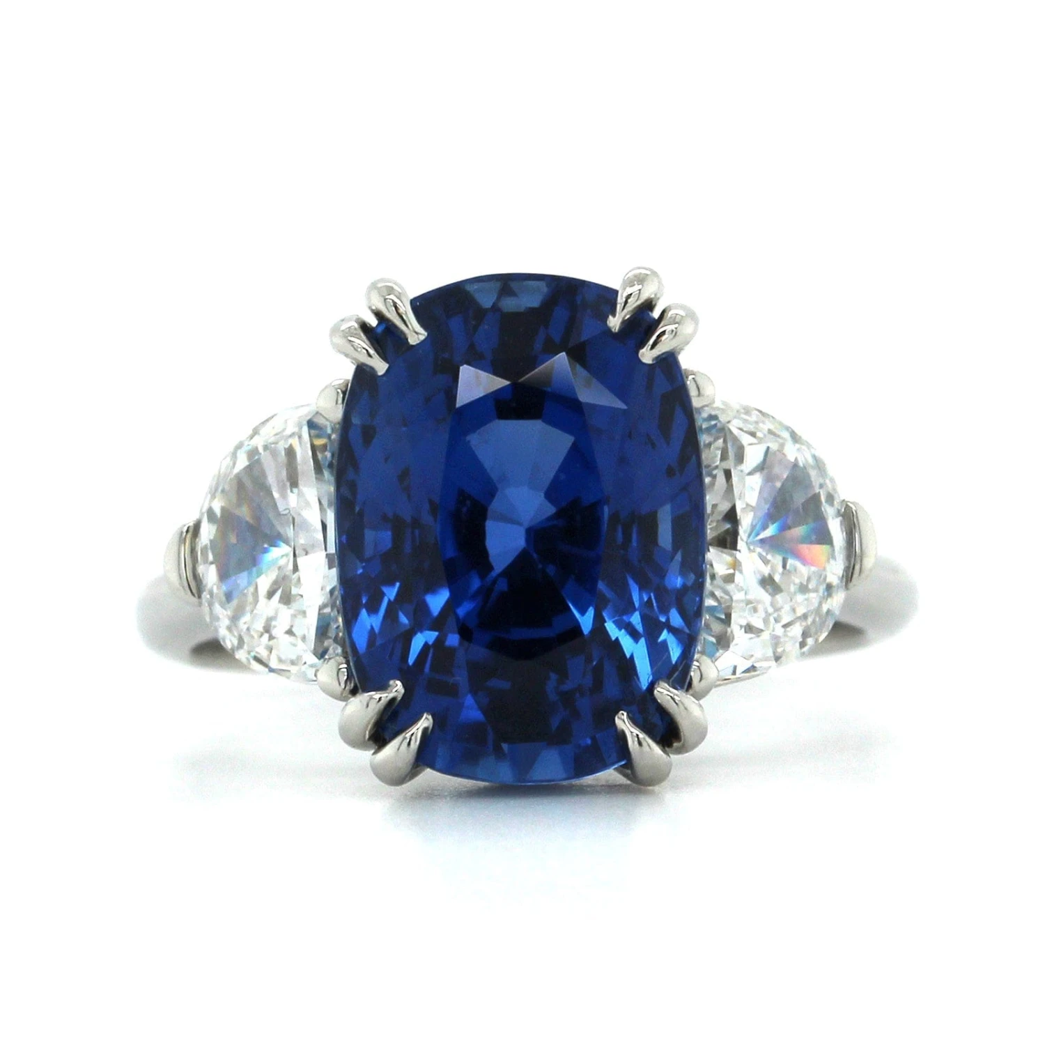 Platinum 3 stone ring with long cushion sapphire and half moon diamond sides.