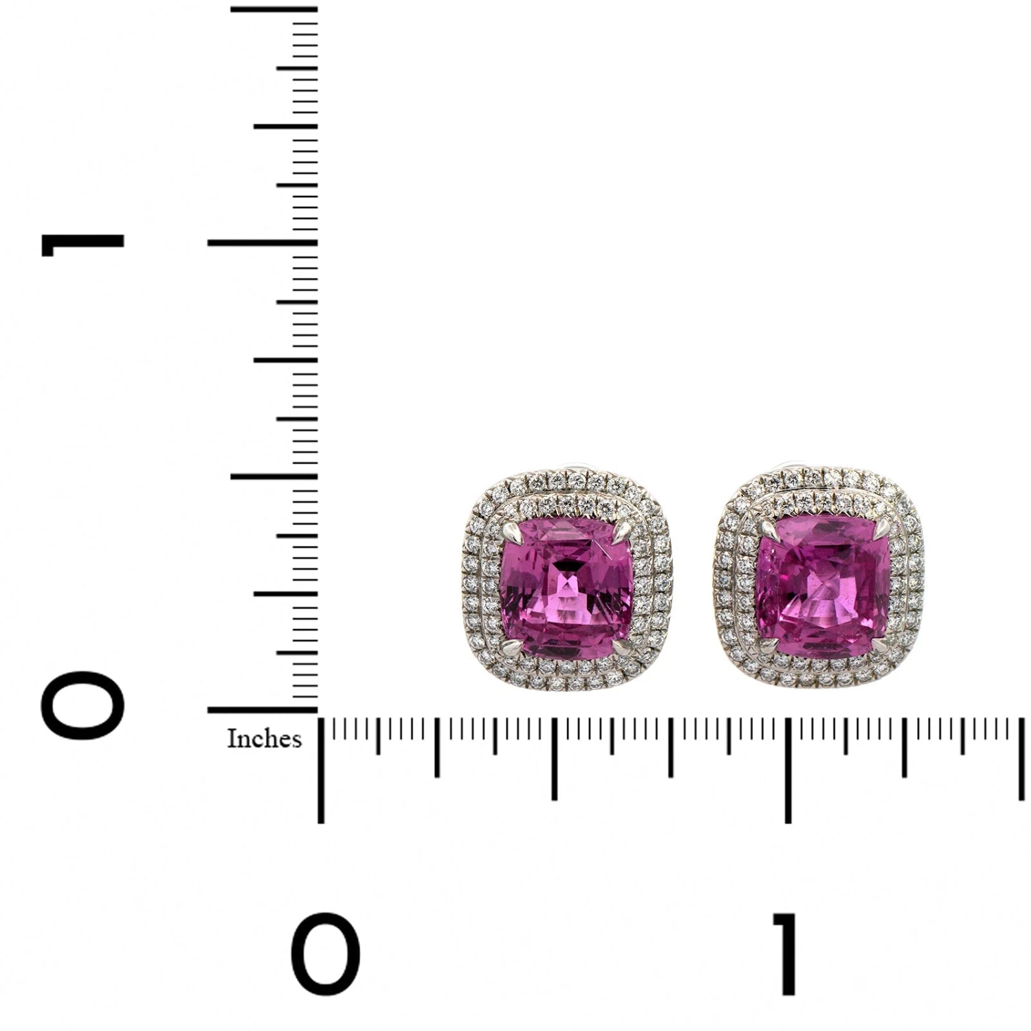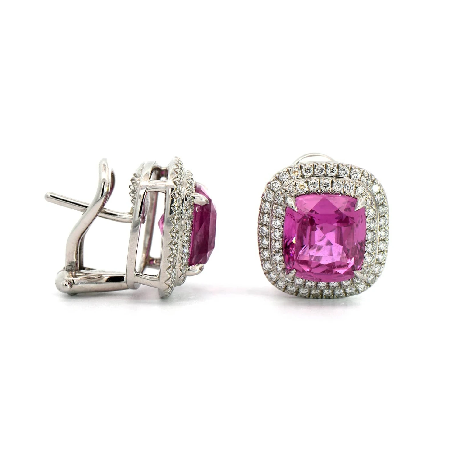 Platinum stud earrings with cushion pink sapphires with a diamond halo.