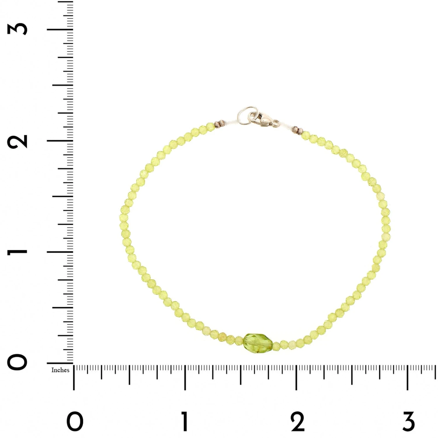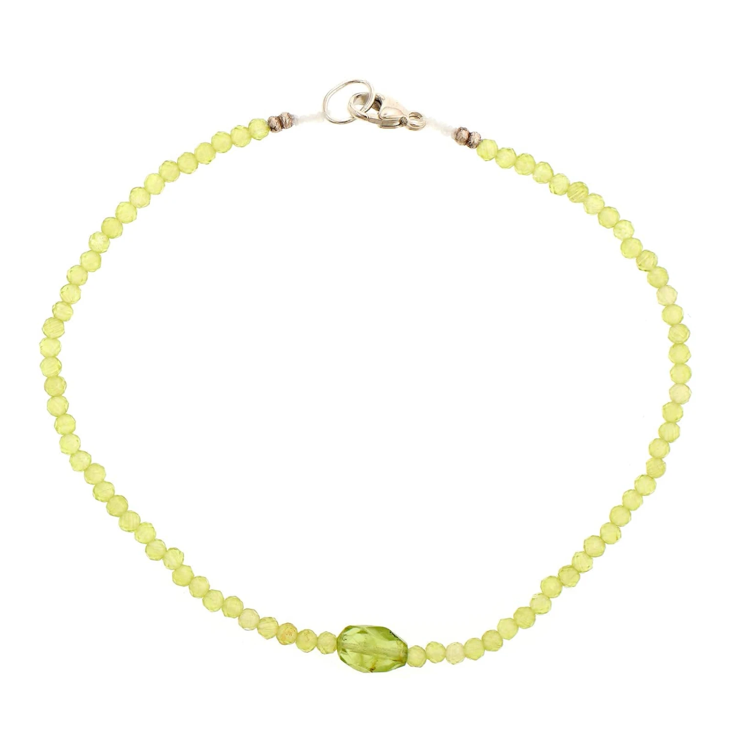 Peridot beaded bracelet with a oval peridot center bead and a sterling silver clasp.